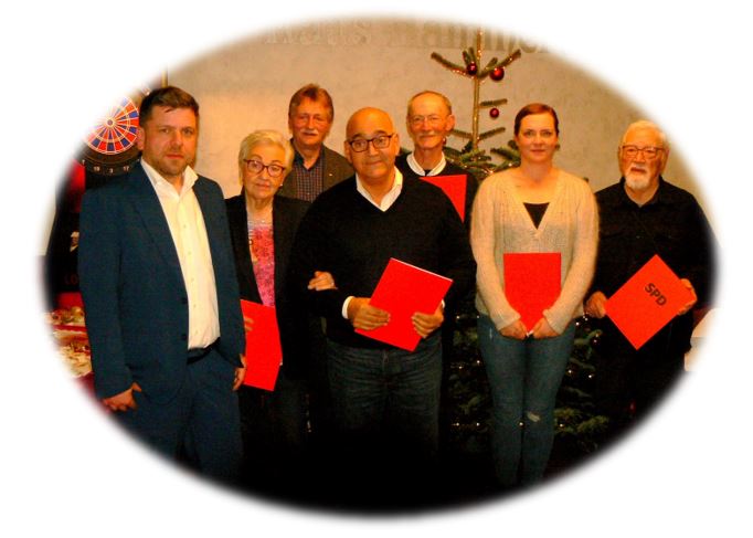 von links: Axel Echeverria (MdB), Heidi El-Attar 10 Jahre, Martin Kuhn Ortsvereinsvorsitzender, Abdel Kader El-Atar 10 Jahre, Thomas Kampmann Ehrenpreis, Elisa Queisser 25 Jahre und Peter Niemann 40 Jahre.