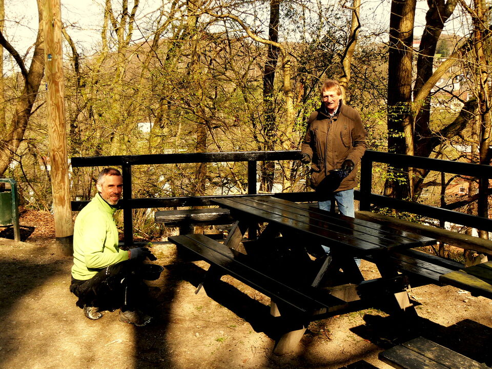 Streichaktion 2025 der SPD Buchholz-Kämpen am Buchholzer Wetterkamin. Hier Frank Blasey und Martin Kuhn. Farbe vom MGV Deutsche Eiche und Buchholzer Heimatverein gespendet.